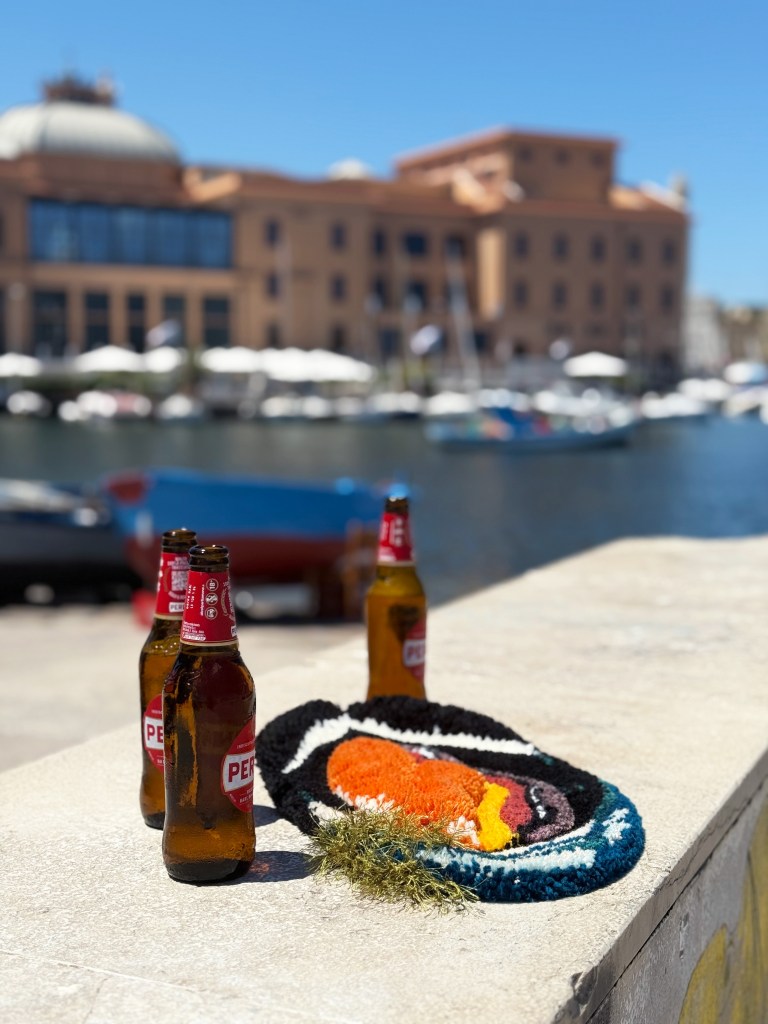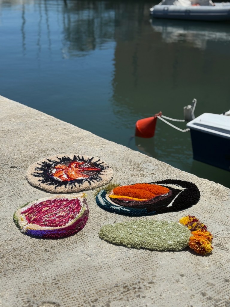 Each rug holds a fragment of Puglia to cherish at home: the fig, reminiscent of endless summers; the mussel, evoking the sea and shared meals; the prickly pear pad, rough and resilient like its people; and the sea urchin, a small treasure left on the shore.
